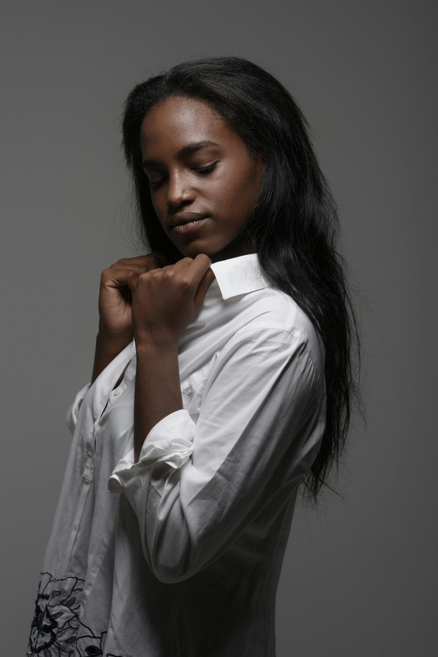 koszula z biżuteryjnymi guzikami. Wyrafinowana i tajemnicza, idealna w zestawieniu z czerwoną szminką.